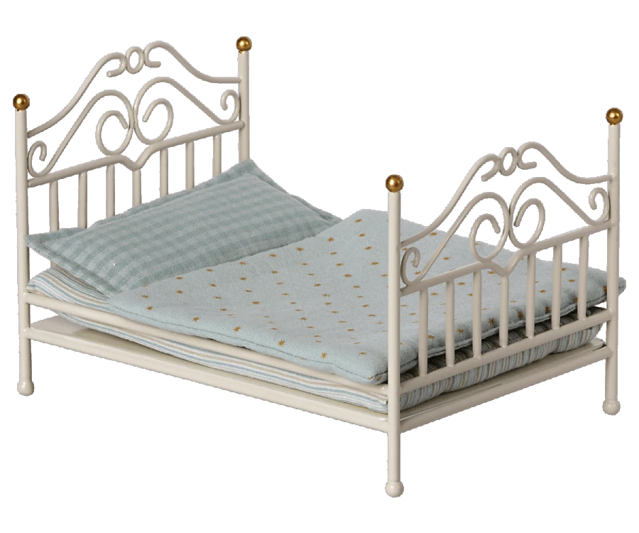 Das perfekte Bett für guten Schlaf. Wer würde sich nicht gerne in dem nostalgischen cremefarbenen Metallbett mit den goldenen Bettknäufen niederlassen wollen. Gemacht ist es für Microhäschen und kleine Mäuschen. Das Bettzeug ist aus den typischen Maileg Stoffen im Nostalgielook und kann variieren. Es ist jedoch immer perfekt abgestimmt. Material: Metall und Baumwolle. Größe: für Micro-Hasen und Mäuse Big Sister/Brother Länge: 19 cm Höhe: ca. 6 cm. Spielzeug für Kinder ab 3 Jahren.