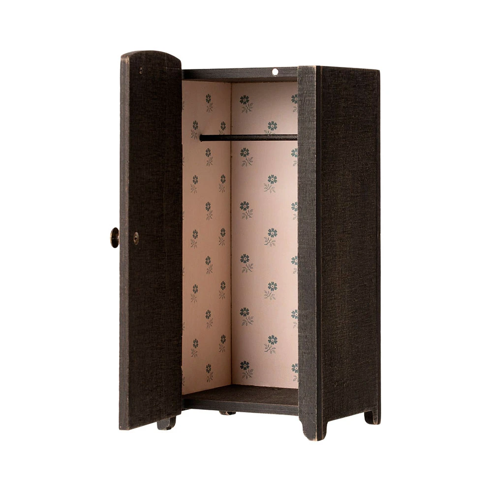Este bonito armario está hecho en madera y pintado a mano para un auténtico look vintage. Cuando lo abres verás flores pintadas en todas las paredes. Contiene una barra para colgar y tres perchas.