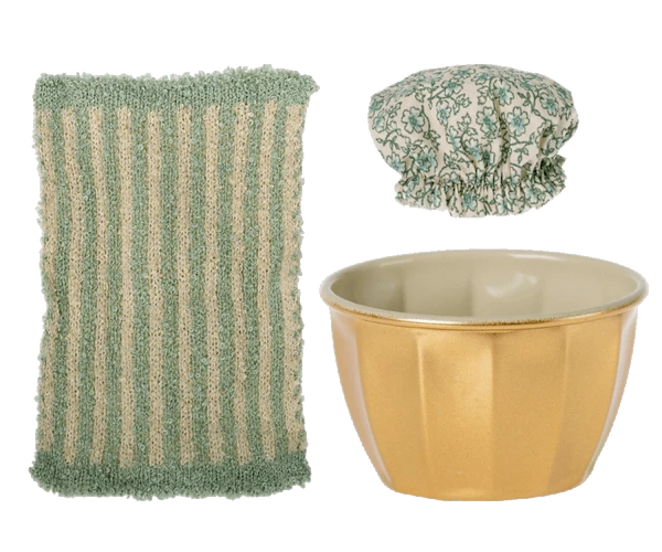 Like everyone else, this mouse loves to spend hours in the warm water in the spa. This playset contains a golden bathtub, a mouse, and a towel. Item No.: 17-2206-00 Size: Big sister/ brother Height: 9 cm Width: 7 cm Recommended age: +3 Year Wash: 30°C Material: Cotton Filling: Recycled polyester/Pe Pellets