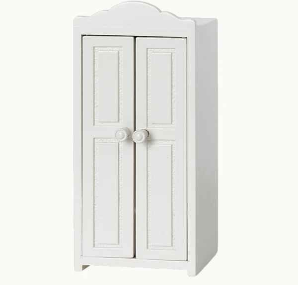 A small closet made of FSC wood. It helps the mice family organizing their wardrobe. The closet comes with 3 golden hangers. Height: 16cm Width: 7cm.